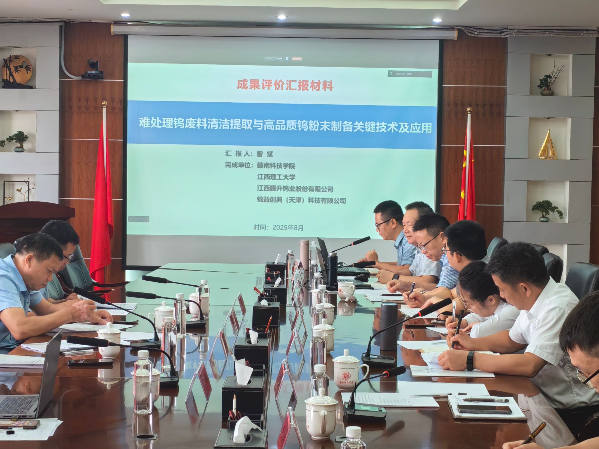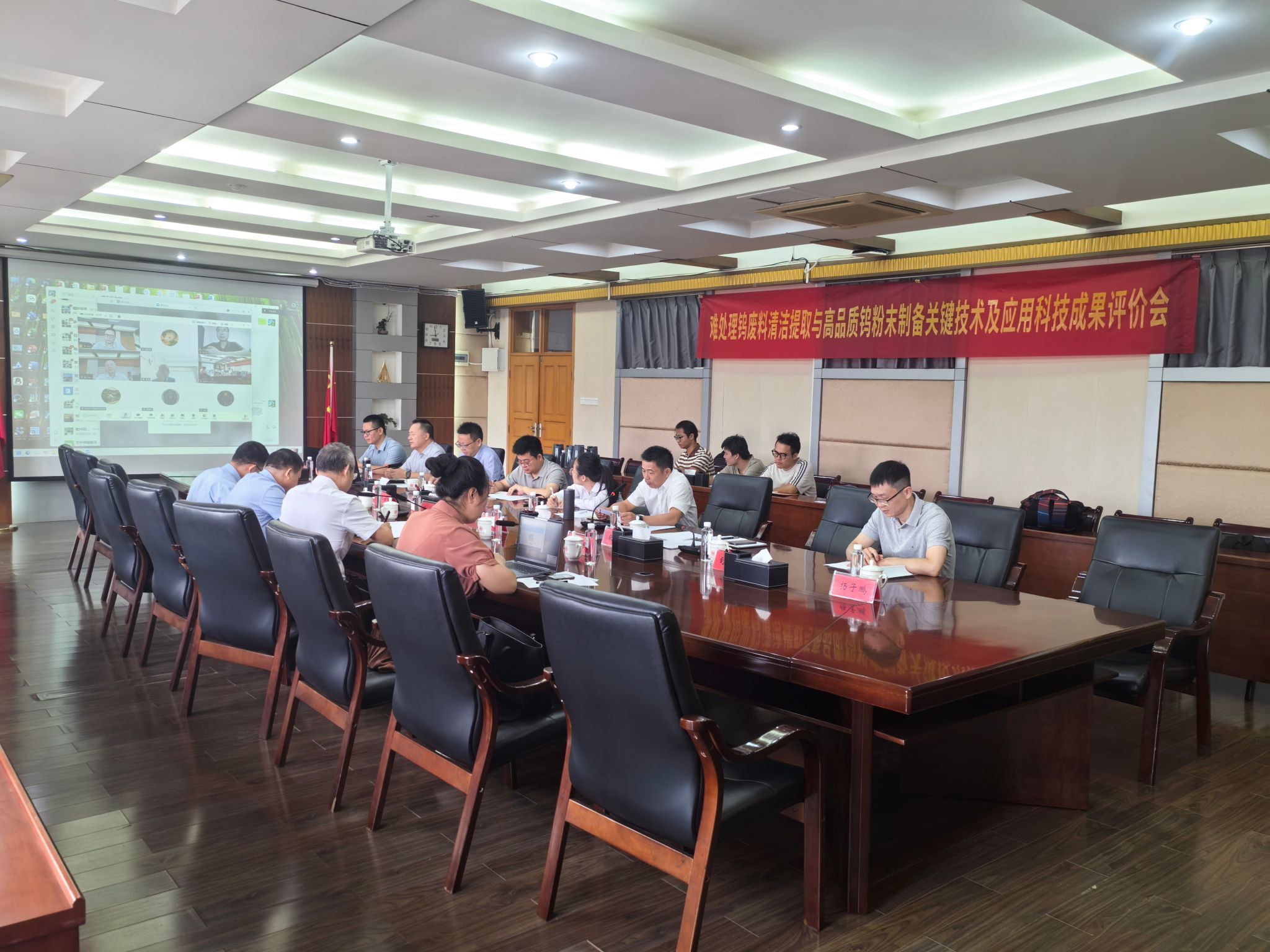 本网讯:8月21日,中国有色金属工业协会在我校召开《难处理钨废料清洁提取与高品质钨粉末制备关键技术及应用》项目科技成果评价会。会议采取线上线下相结合方式举行。评价会邀请中国工程院张文海院士等5位专家组成评价委员会,对由我校牵头、江西理工大学、江西耀升钨业股份有限公司、锦益创典(天津)科技有限公司等单位共同完成的科技成果进行评价。学校党委委员、副校长何锦龙,科技处相关负责人,智能制造与材料工程学院项目负责人及项目组成员在崇善楼第一会议室参会。