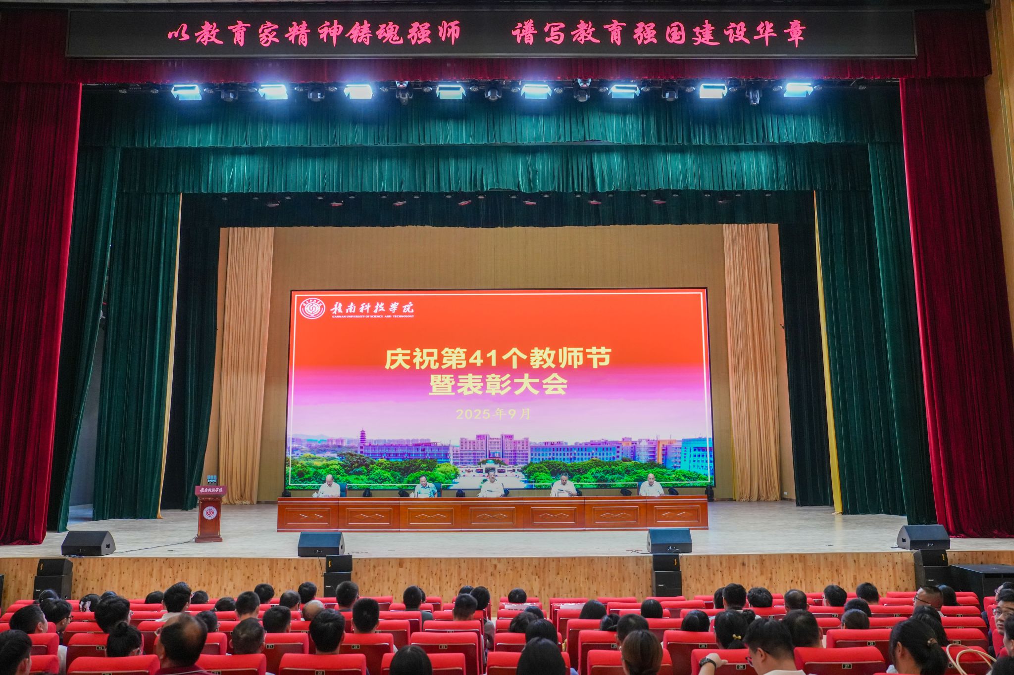 本网讯:9月10日下午,我校庆祝第41个教师节暨表彰大会在大学生活动中心会堂举行。在家校领导邱建军、邱建丁、陈文新、蓝晓植、邓亦林与广大教师共同参加,庆祝属于教师的光荣节日。会议由党委委员、纪委书记陈文新主持。
