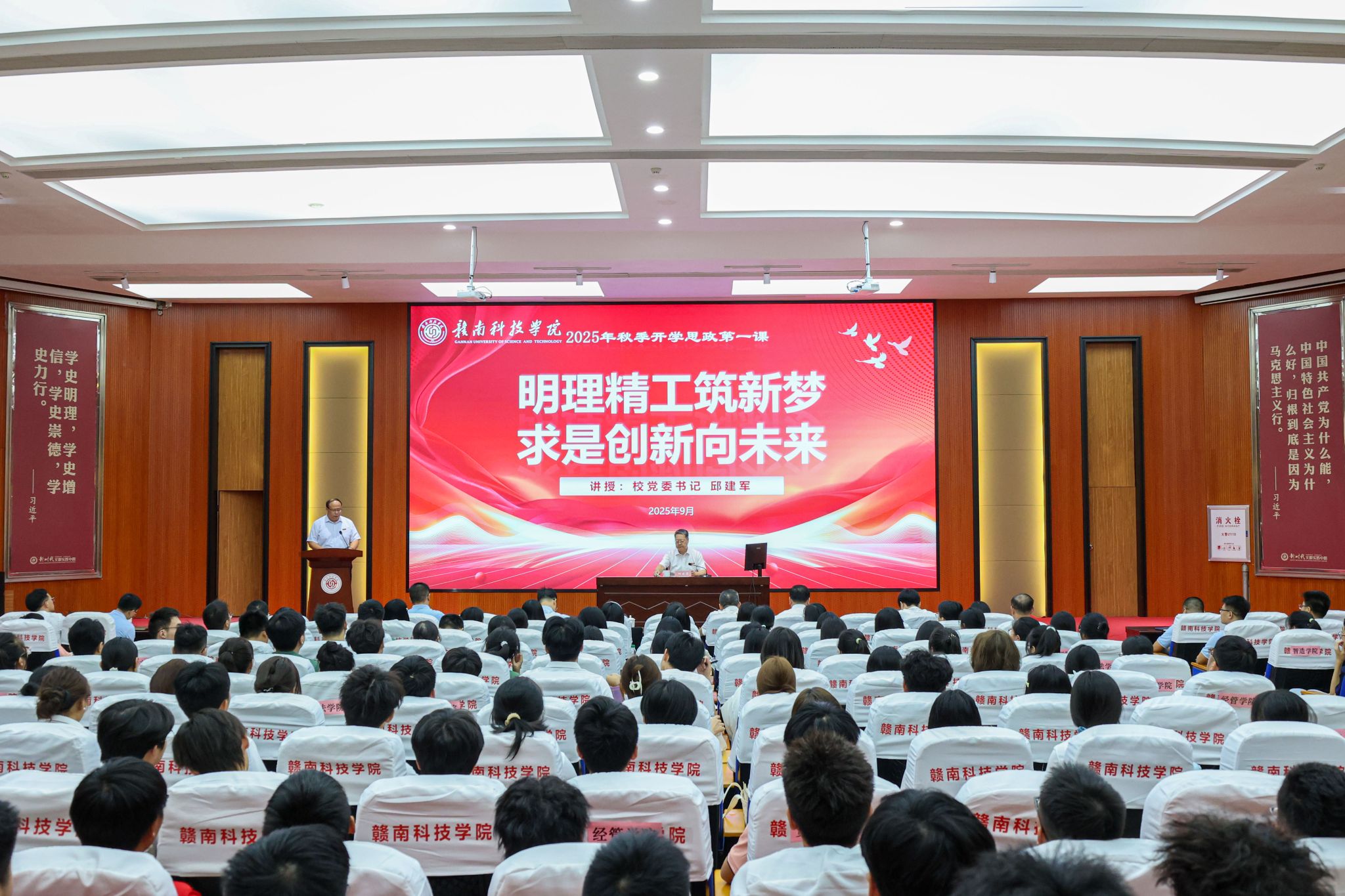 校党委委员、副校长左群在主持活动时指出,“开学第一课”既是生动深刻的理想信念课,也是凝心聚力的青春启航动员。希望同学们认真领会殷切嘱托,珍惜大学时光,筑牢理想信念,锤炼过硬本领,将个人成长融入时代发展洪流,以实际行动传承红色基因,努力成为担当民族复兴大任的时代新人,为赣南革命老区高质量发展示范区建设贡献青春、智慧和力量。
