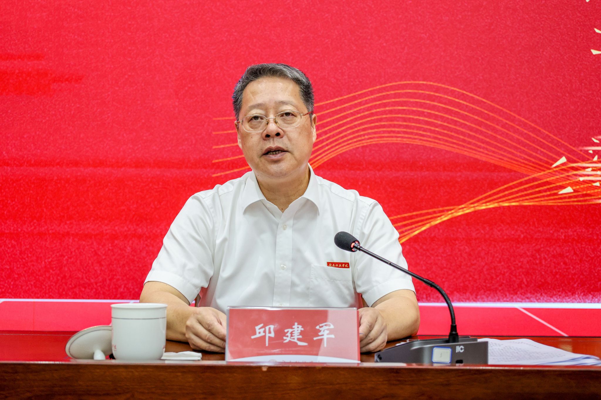 邱建军首先代表学校党政班子和全体师生员工,向来自五湖四海的新同学表示热烈欢迎。他从“红土铸魂—中央苏区精神的时代传承”“现实写照—奋斗者的赣科叙事”“拥抱变革—AI时代的明理精工”三个维度展开深入解读,勉励同学们深刻感悟红土圣地的精神力量,积极拥抱时代变革,恪守“明理精工、求是创新”校训,在这片充满希望的热土上,练就过硬本领,锤炼高尚品格,努力成长为可堪大用、能担重任的栋梁之才。