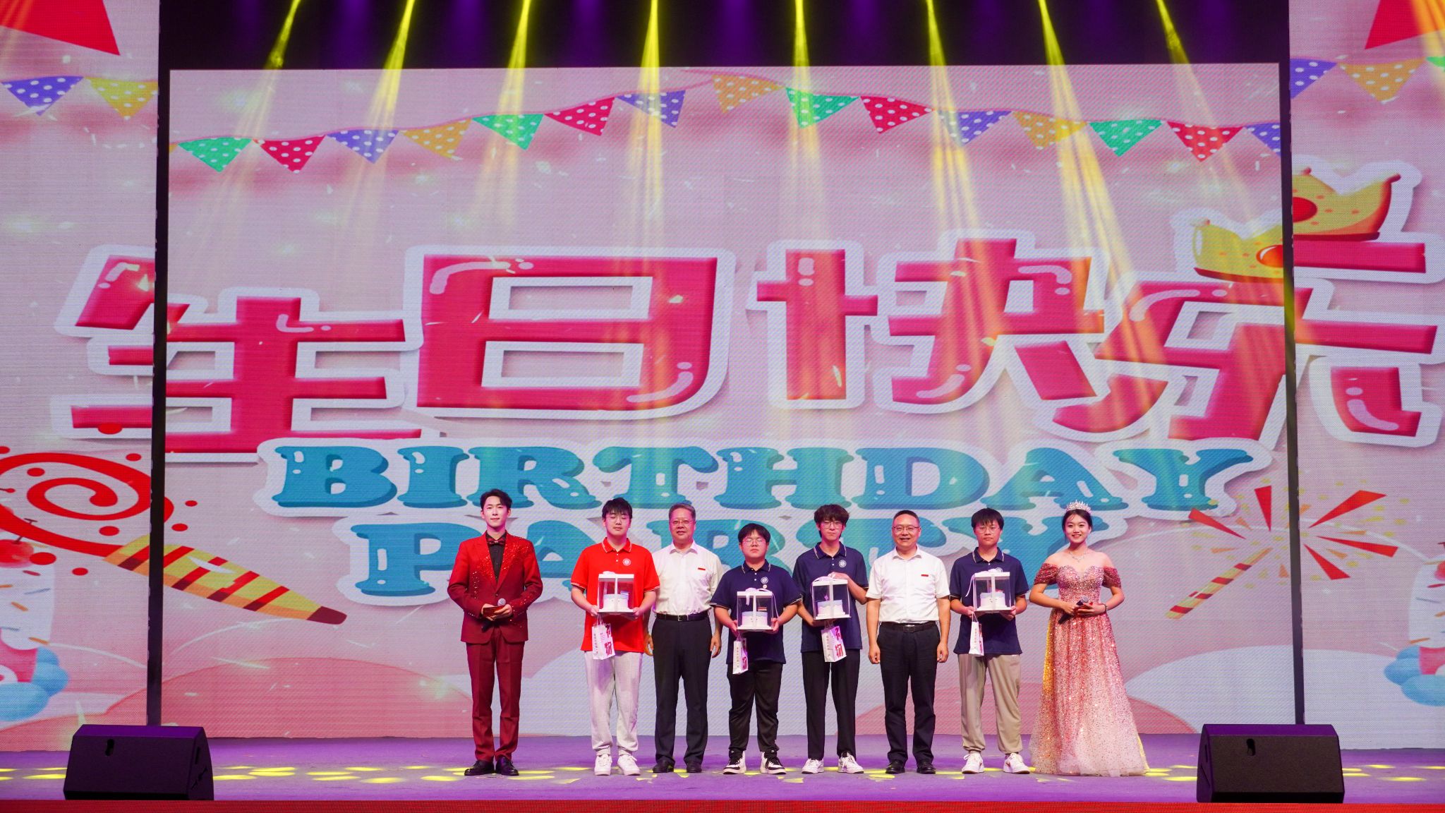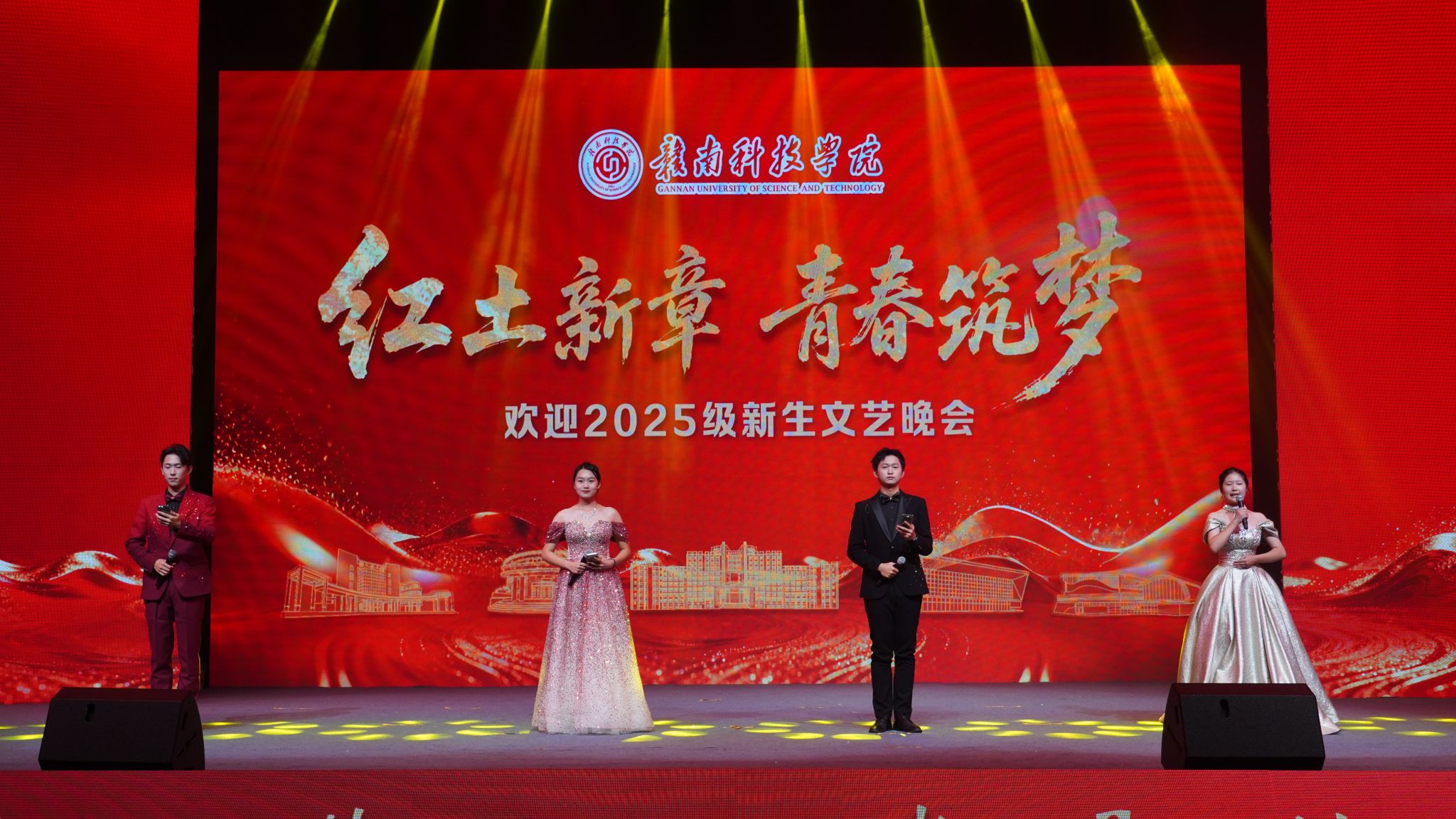 迎新晚会以“初见·启航”“同行·求索”“绽放·奋进”三大篇章为主线,巧妙融合歌曲、舞蹈、朗诵等多种艺术形式,为现场观众打造了一场艺术与情感交织的视听盛宴。特别是晚会互动环节温情满满,校党委书记邱建军和党委副书记、校长邱建丁为当日过生日的4名新生送上生日蛋糕并致以诚挚祝福。随后,各学院班主任、辅导员代表依次登台,以质朴真挚的话语向同学们传递嘱托与期许,鼓励大家在赣科这片梦想沃土上勇敢启程、坚守热爱,努力成长为德才兼备、胸怀家国、放眼世界的卓越人才。