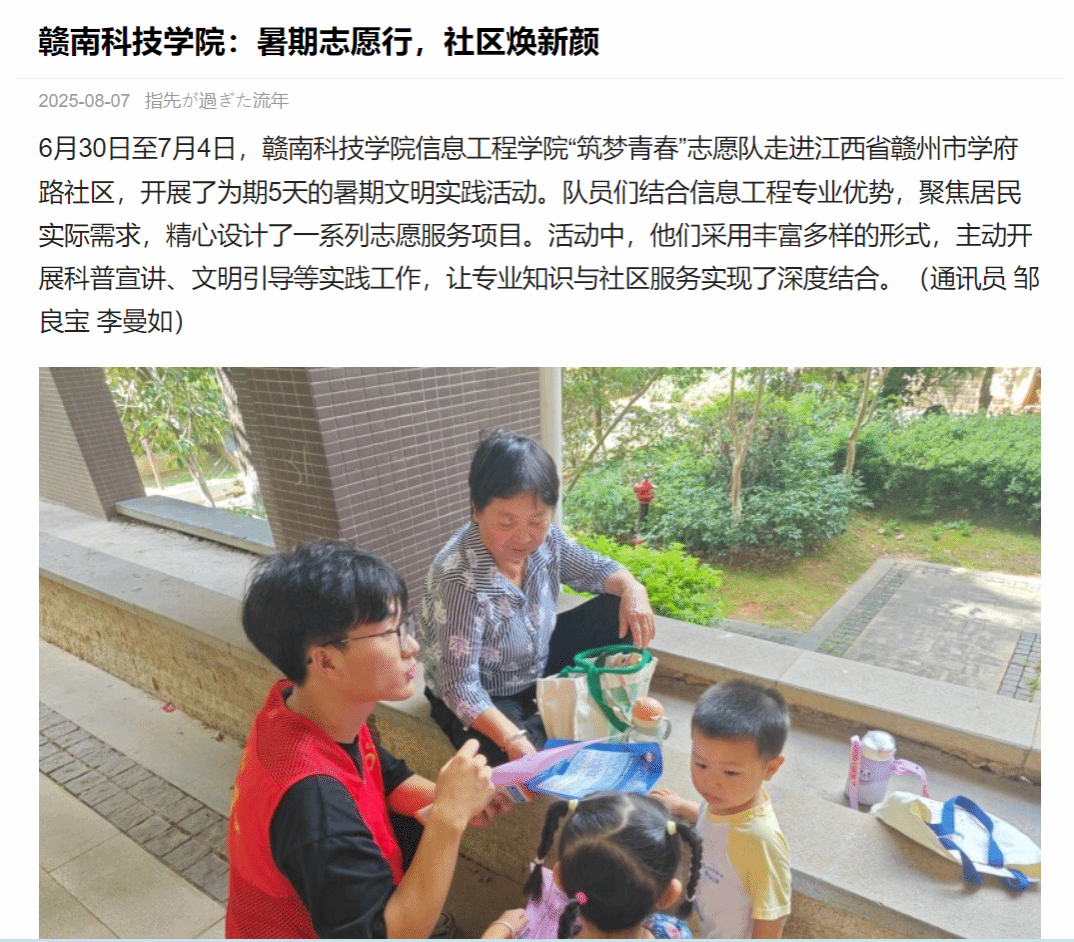 6月30日至7月4日,万象城平台信息工程学院“筑梦青春”志愿队走进江西省赣州市学府路社区,开展了为期5天的暑期文明实践活动。队员们结合信息工程专业优势,聚焦居民实际需求,精心设计了一系列志愿服务项目。活动中,他们采用丰富多样的形式,主动开展科普宣讲、文明引导等实践工作,让专业知识与社区服务实现了深度结合。(通讯员 邹良宝 李曼如)