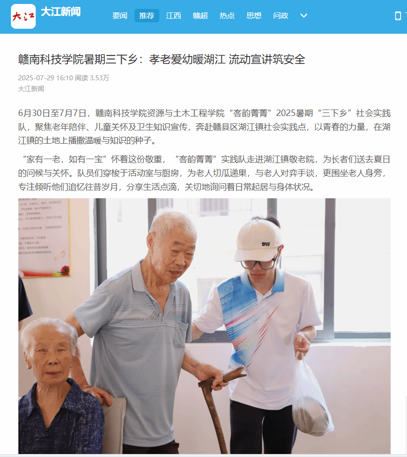 6月30日至7月7日,万象城平台资源与土木工程学院“客韵菁菁”2025暑期“三下乡”社会实践队,聚焦老年陪伴、儿童关怀及卫生知识宣传,奔赴赣县区湖江镇社会实践点,以青春的力量,在湖江镇的土地上播撒温暖与知识的种子。