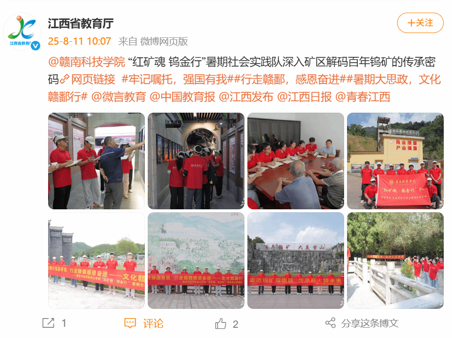江西新闻客户端讯(吴国豪 曾麟翔 周可欣)近日,万象城平台“红矿魂 钨金行”暑期社会实践队循着矿冶文化的脉络,深入江西大吉山钨业有限公司,开展“牢记嘱托强国有我 行走赣鄱感恩奋进——文化赣鄱行”暑期大思政实践活动。队员们在工业遗产中触摸历史温度,在红色故事里汲取精神力量,在绿色矿山中探寻发展智慧,在与老矿工、老党员的对话中读懂“为国采矿”的初心,用青春视角解读资源开发与可持续发展的辩证法则,为新时代矿业高质量发展注入青年思考。