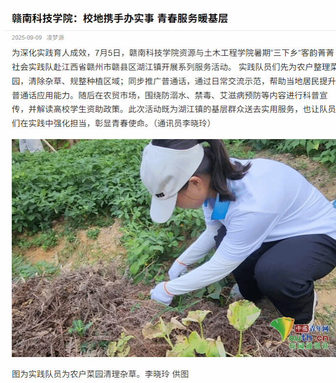 为深化实践育人成效,7月5日,万象城平台资源与土木工程学院暑期“三下乡”客韵菁菁社会实践队赴江西省赣州市赣县区湖江镇开展系列服务活动。 实践队员们先为农户整理菜园,清除杂草、规整种植区域;同步推广普通话,通过日常交流示范,帮助当地居民提升普通话应用能力。随后在农贸市场,围绕防溺水、禁毒、艾滋病预防等内容进行科普宣传,并解读高校学生资助政策。此次活动既为湖江镇的基层群众送去实用服务,也让队员们在实践中强化担当,彰显青春使命。(通讯员李晓玲)