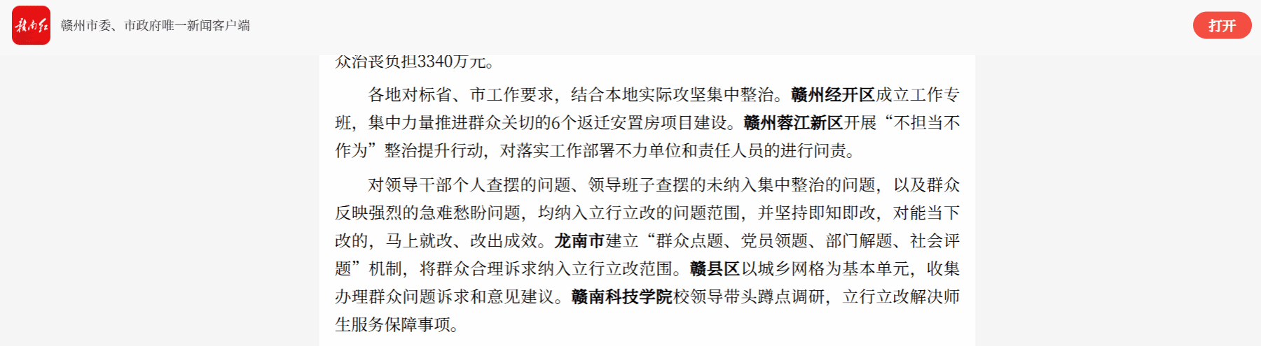 各地对标省、市工作要求,结合本地实际攻坚集中整治。赣州经开区成立工作专班,集中力量推进群众关切的6个返迁安置房项目建设。赣州蓉江新区开展“不担当不作为”整治提升行动,对落实工作部署不力单位和责任人员的进行问责。