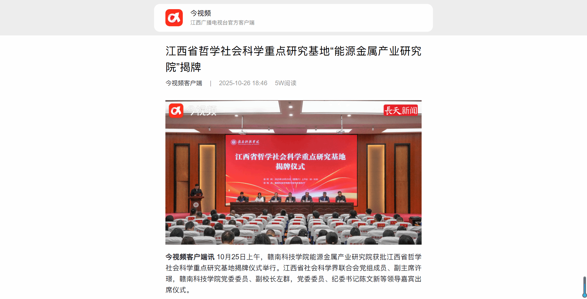左群在致辞中表示,该校能源金属产业研究院成功获批省级重点研究基地,是对该校学科建设和科研能力的充分肯定,也是该校服务地方发展的坚定承诺。学校已将研究院建设纳入战略优先方向,将在经费投入、人才引进、基础设施和机制创新等方面提供全方位支持,致力于将其打造成为战略研究高地、决策咨询智库、技术服务引擎与创新人才摇篮,力争建设成一个在省内具有话语权、国内具备影响力、国际上享有知名度的专业平台,为破解有色金属新能源产业发展的“卡脖子”难题、探索具有江西特色的高质量发展路径贡献更多融合“社科智慧”与“科技力量”的系统性解决方案。