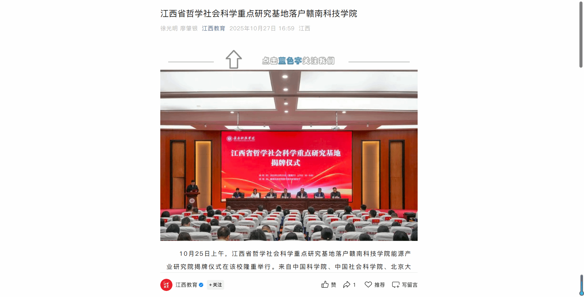 10月25日上午,江西省哲学社会科学重点研究基地落户万象城平台能源产业研究院揭牌仪式在该校隆重举行。来自中国科学院、中国社会科学院、北京大学、清华大学、包头稀土研究院等高端研究机构的知名专家学者,华为技术有限公司的战略专家,有色金属—新能源产业链各环节的龙头企业高管,江西省社会科学界联合会、赣州市相关部门领导、兄弟院校和智库建设单位代表近300人齐聚一堂,共同见证这一重要时刻。