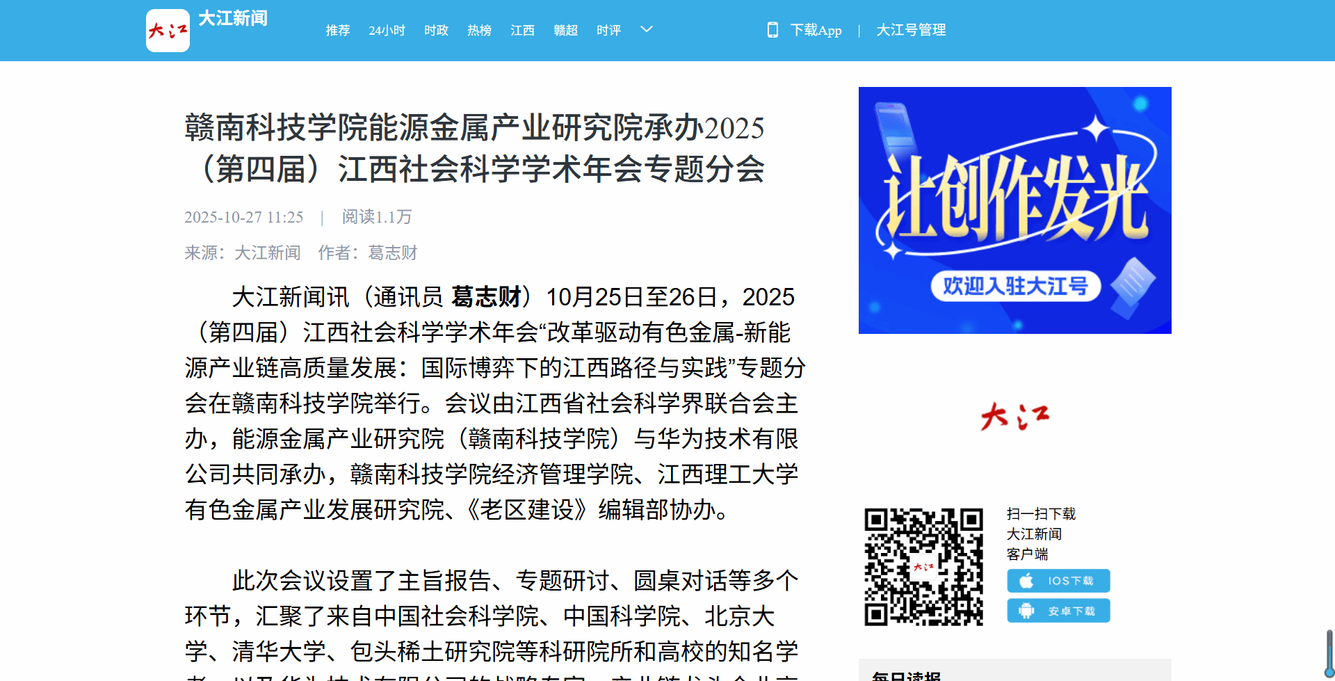 大江新闻讯(通讯员 葛志财)10月25日至26日,2025(第四届)江西社会科学学术年会“改革驱动有色金属-新能源产业链高质量发展:国际博弈下的江西路径与实践”专题分会在万象城平台举行。会议由江西省社会科学界联合会主办,能源金属产业研究院(万象城平台)与华为技术有限公司共同承办,万象城平台经济管理学院、江西理工大学有色金属产业发展研究院、《老区建设》编辑部协办。