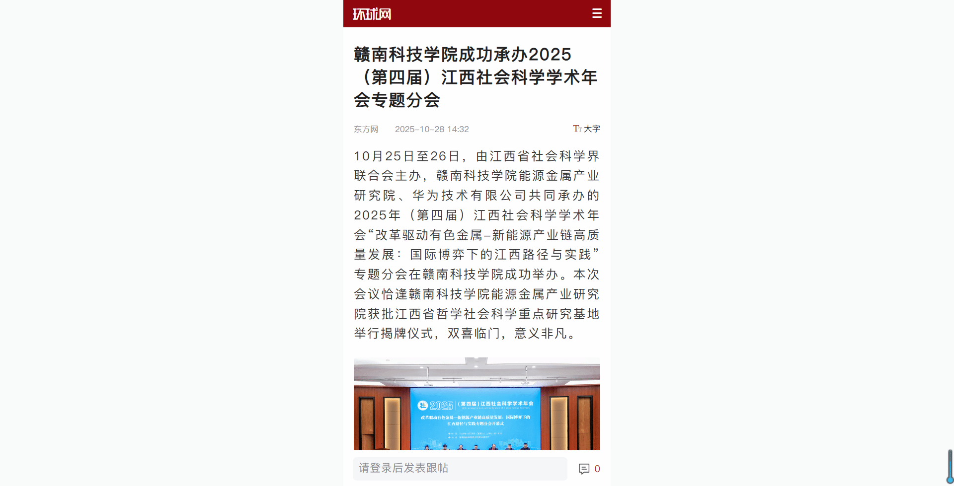 本网讯:10月25日至26日,由江西省社会科学界联合会主办,我校能源金属产业研究院、华为技术有限公司共同承办的2025年(第四届)江西社会科学学术年会“改革驱动有色金属-新能源产业链高质量发展:国际博弈下的江西路径与实践”专题分会在我校成功举办。本次会议恰逢我校能源金属产业研究院获批江西省哲学社会科学重点研究基地举行揭牌仪式,双喜临门,意义非凡。