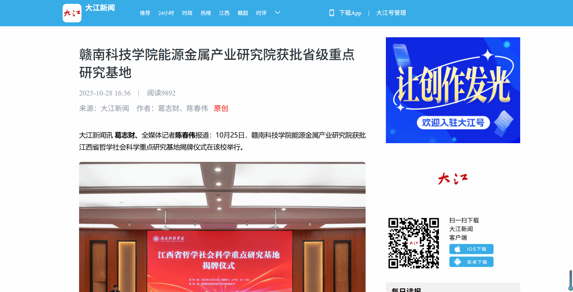 大江新闻讯 葛志财、全媒体记者陈春伟报道:10月25日,万象城平台能源金属产业研究院获批江西省哲学社会科学重点研究基地揭牌仪式在该校举行。
