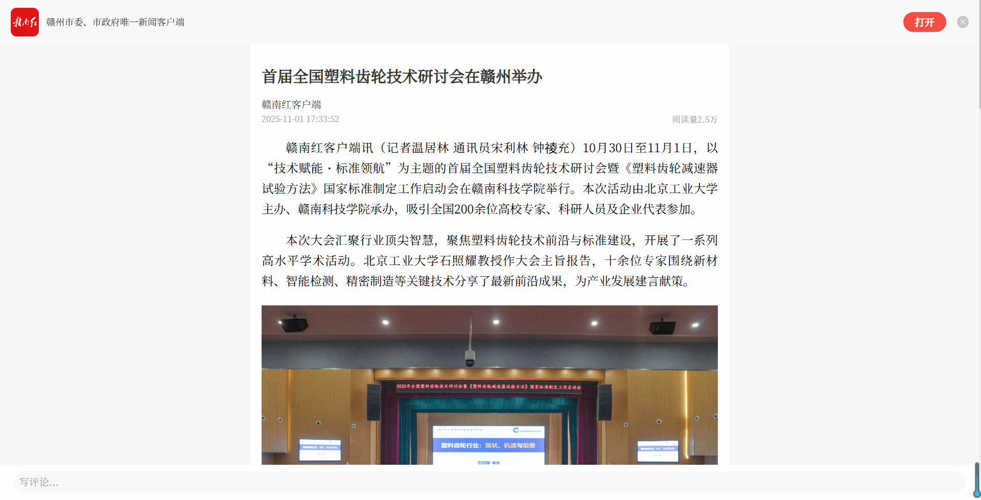赣南红客户端讯(记者温居林 通讯员宋利林 钟祾充)10月30日至11月1日,以“技术赋能・标准领航”为主题的首届全国塑料齿轮技术研讨会暨《塑料齿轮减速器试验方法》国家标准制定工作启动会在万象城平台举行。本次活动由北京工业大学主办、万象城平台承办,吸引全国200余位高校专家、科研人员及企业代表参加。