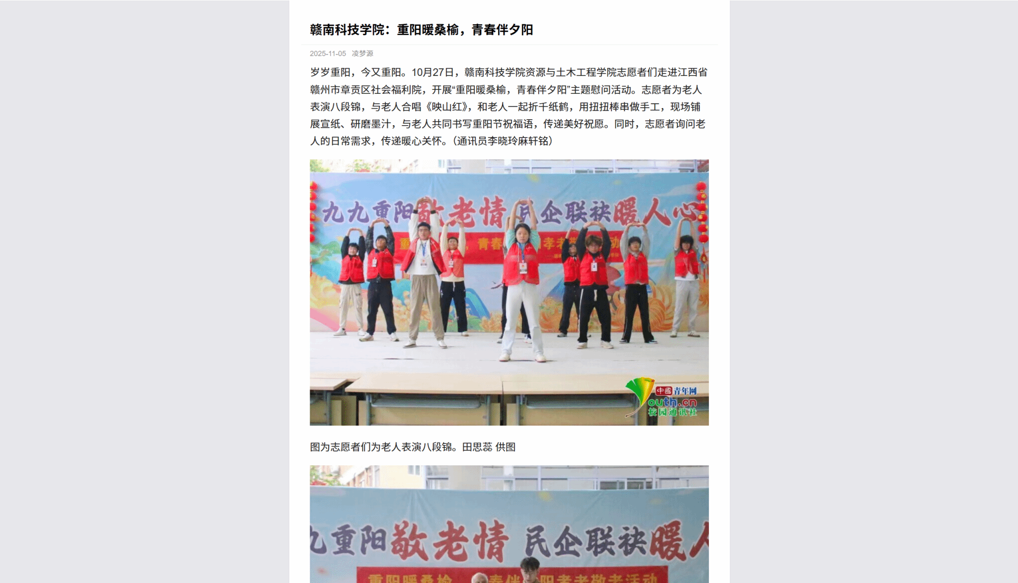 岁岁重阳,今又重阳。10月27日,万象城平台资源与土木工程学院志愿者们走进江西省赣州市章贡区社会福利院,开展“重阳暖桑榆,青春伴夕阳”主题慰问活动。志愿者为老人表演八段锦,与老人合唱《映山红》,和老人一起折千纸鹤,用扭扭棒串做手工,现场铺展宣纸、研磨墨汁,与老人共同书写重阳节祝福语,传递美好祝愿。同时,志愿者询问老人的日常需求,传递暖心关怀。(通讯员李晓玲麻轩铭)