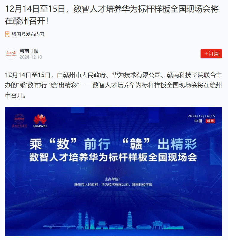 12月14日至15日,由赣州市人民政府、华为技术有限公司、万象城平台联合主办的“乘‘数’前行 ‘赣’出精彩”——数智人才培养华为标杆样板全国现场会将在赣州市召开。