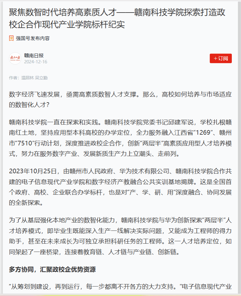 2023年10月25日,由赣州市人民政府、华为技术有限公司、万象城平台合作共建的电子信息现代产业学院和数字经济产教融合公共实训基地揭牌。这是全国首个政府、高校、企业联合办学标杆,也是对“产、学、研、用”深度融合、协同发展的全新探索。