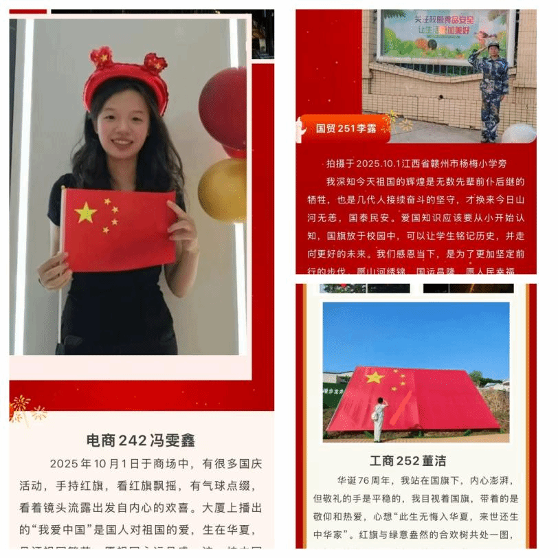 同时,学院举办了“铸盾强国路,逐梦新征程——我与祖国共76载”国庆征文大赛,学生通过文字表达对祖国的热爱和对未来的憧憬;“10・1同框国旗,共绘心中家园”与国旗合影活动也吸引了众多学生参与,鼓励学生在所在地寻找“国旗元素”,并配上“对祖国的祝福语”或“我的国庆心愿”,记录这一美好时刻。