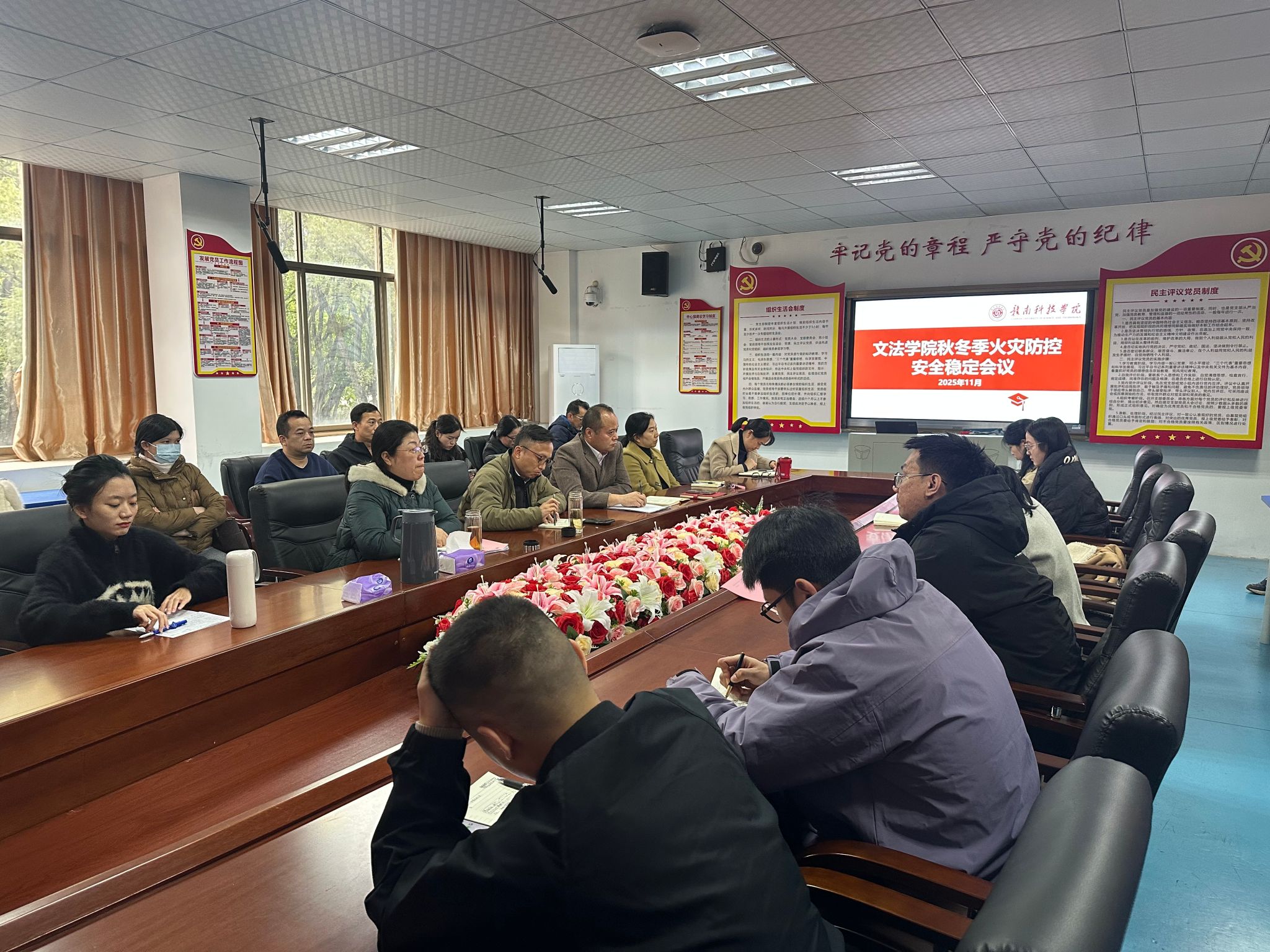 本网讯:11月18日,文法学院组织召开全院秋冬季火灾防控安全稳定会议,部署学生管理及宿舍安全专项排查工作。学院党委委员、副院长高健婕,党委委员、副院长李敏,党委委员王军堂以及全体辅导员、班主任参加会议。
